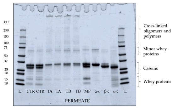 The composition of permeate produced from CTR and treated feeds is shown in Table 2. The total solids of TA and TB permeate were comparable (p > 0.05), and significantly (p < 0.05) higher than CTR permeate. The total nitrogen was significantly (p < 0.05) lower in both TA and TB permeate, when compared to CTR. The ash content was low and not significantly (p > 0.05) different among the three permeates. The pH of TA and TB was comparable (p > 0.05), while significantly (p < 0.05) higher than for CTR permeate, in agreement with the high pH of TA and TB feeds (Table 1). The CTR permeate had significantly higher viscosity (2.4 ± 0.4 mPas) than TA permeate (1.8 ± 0.3 mPas), which might be due to its significantly (p < 0.05) higher protein content as represented by total nitrogen. The lowest viscosity of TA permeate can be linked to temperature-dependent crosslinking action of mTG on proteins in TA feed, particularly β-casein. The higher protein concentration in solution results in greater interactions which reduce space between molecules and causes lower water mobility and higher viscosity []. Moreover, β-casein is reported to have a high intrinsic viscosity at low temperature (5 °C) [], which might explain the high viscosity of CTR permeate.