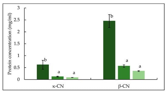 The electrophoretic pattern of permeate produced from crosslinked feed is shown in Figure 8. Both TA and TB permeate contain bands for proteins which migrated as expected of native individual caseins, suggesting these proteins were not crosslinked by mTG. In TB permeate, a low intensity band of β-casein was visible, suggesting that some proportion β-casein (monomeric) was not crosslinked, supporting the finding from absorbance and turbidity development results. In both TA and TB permeate, κ-casein bands were not visible, while low intensity bands for αs-casein were identified. The low intensity bands of β-lactoglobulin and α-lactalbumin were also observed in TA and TB permeate (Figure 8), in agreement with the findings of Sharma et al. []. Sharma et al. [] and Faergemand et al. [], showed that both β-lactoglobulin and α-lactalbumin are susceptible to mTG action even without significant changes in their native structure. To quantify the concentration of individual protein in the permeate, RP-HPLC was used and peaks for β- and κ-casein were identified as shown in Figure 9. The concentrations of both β- and κ-casein were significantly (p < 0.05) higher in CTR permeate, while TA and TB permeate had comparable concentrations of β- and κ-caseins. No peaks for αs-casein were identified in any permeate sample, which is in agreement with the findings of France et al. [], who studied the impact of low processing temperature (4 °C) on filtration performance and protein fractionation during MF of skim milk.