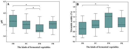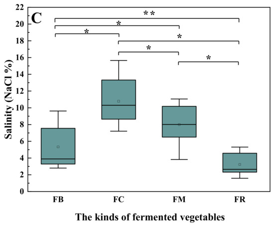 Figure 1. Physicochemical characteristics of different types of fermented vegetables: (A) pH, (B) titratable acidity, and (C) salinity. FB, fermented bamboo; FC, fermented cabbage; FM, fermented mustard; FR, fermented radish; * indicates significantly different means at p < 0.05; ** indicates significantly different means at p < 0.01.