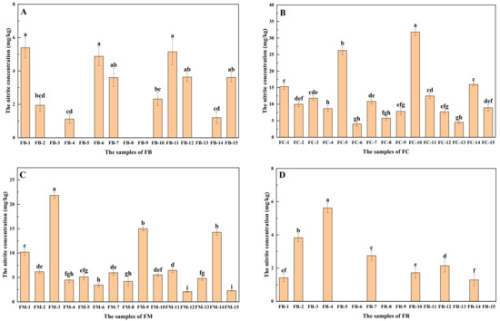 Figure 2. The concentration of nitrite in different types of fermented vegetables: (A) fermented bamboo, (B) fermented cabbage, (C) fermented mustard, and (D) fermented radish. FB, fermented bamboo; FC, fermented cabbage; FM, fermented mustard; FR, fermented radish. The different letters (a, b, c, etc.) indicate significantly different (Duncan’s test, p < 0.05).