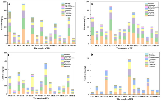 Figure 3. The concentration of biogenic amines in different types of fermented vegetables: (A) fermented bamboo, (B) fermented cabbage, (C) fermented mustard, and (D) fermented radish. FB, fermented bamboo; FC, fermented cabbage; FM, fermented mustard; FR, fermented radish.