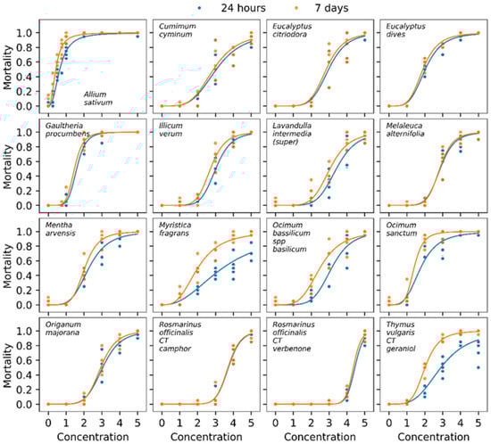 Mortality curves of EOs tested on S. granarius 24 h after treatment (blue) and 7 days after treatment (orange).