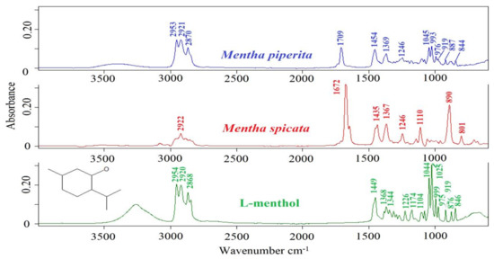 ATR-FTIR spectra of Mentha piperita EO, Mentha spicata EO and L-menthol in the 4000–400 cm−1 spectral region.
