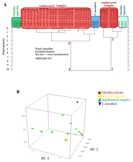 HCA dendrogram of FTIR spectra from Mentha piperita, Mentha spicata, L-menthol, and adulterated samples (A) 3-D PCA plot of FTIR spectra from Mentha piperita, Mentha spicata, L-menthol, and adulterated samples (B).