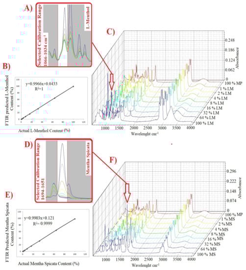 Selected spectral range for quantification L-menthol (A) PLSR-raw spectra regression cross-validation plot for L-menthol (B) 3-D superimposed FTIR spectra of L-menthol adulterated samples (C) Selected spectral range for quantification Mentha spicata (D) PLSR-raw spectra regression cross-validation plot for Mentha spicata (E) 3-D superimposed FTIR spectra of Mentha spicata adulterated samples (F).