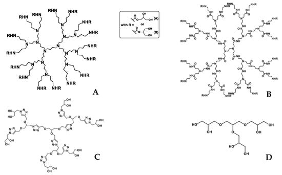 Structures of dendrimers: (A) Glycerodendrimers polypropylenimine 3rd generation (GD-PPI-3). (B) Glycerodendrimers polyamidoamine 2nd generation (GD-PAMAM). (C) Glyceroclikdendrimers 2nd generation (GCD-2). (D) Glyceroladendrimers 1st generation (GAD).
