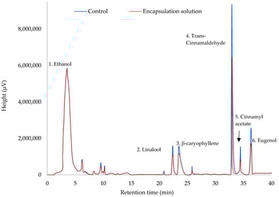 Overlaying of chromatographic analysis of free cinnamon EO (control) and cinnamon EO encapsulated within GD-PPI-3 under optimized conditions—(1) ethanol (sample solvent), (2) linalool, (3) β-caryophyllene, (4) trans-cinnamaldehyde, (5) cinnamyl acetate, (6) eugenol.