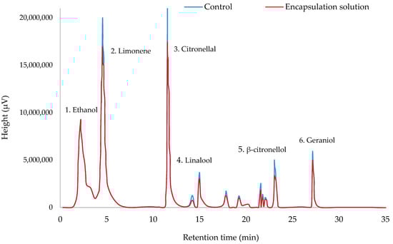 Overlaying of chromatographic analysis of free Java citronella EO (control) and Java citronella EO encapsulated within GD-PAMAM-2 under optimized conditions—(1) ethanol (sample solvent), (2) limonene, (3) citronellal, (4) linalool, (5) β-citronellol, (6) geraniol.