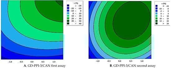 Contour plots showing the crossed effect of duration (D) and rate of stirring (R) on the retention rate (r) of cinnamon essential oil by GD-PPI-3 with the first sets of parameters (A) and the second one (B).