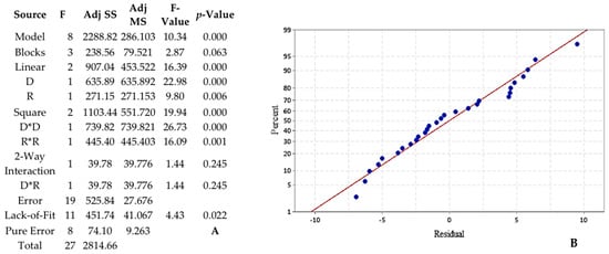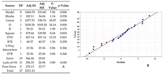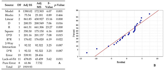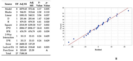 Analysis of variance (ANOVA) for the response surface methodology (RSM) (A) and normal probability plot of the residuals of GD-PPI−3/CAN EO (2) (B).