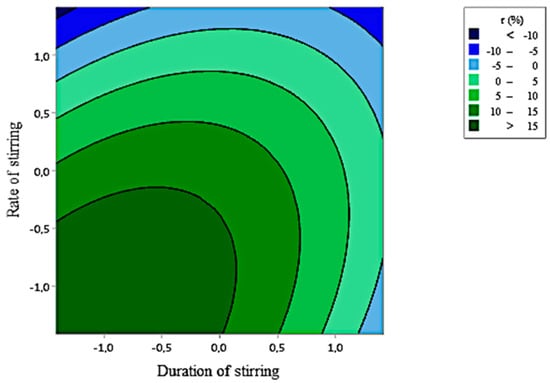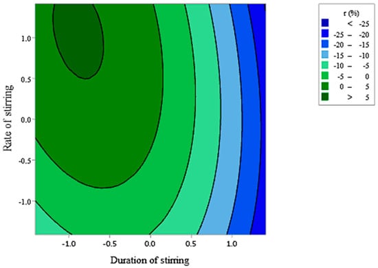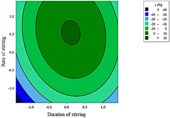 Contour plot present in Figure 4B illustrates the level of parameters that allowed to reach the maximum of retention (>20%) which can be found with a stirring time between 240 and 420 min at a rate between 1500 and 2000 rpm.