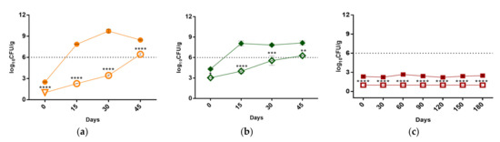 Evaluation of total aerobic mesophiles at 30 °C of (a) Macroalgae-fortified meat frankfurter sausage (non-pressurized—●, pressurized—○, and ▽—pressurized and below the detection limit), (b) Macroalgae-fortified vegetable frankfurter sausage (non-pressurized—◆ and pressurized—◇) and (c) Macroalgae-fortified traditional Portuguese sausage (pressurized and below the detection limit—□ and non-pressurized—■) during storage at 4 °C. *, **, ***, **** indicate significant differences between each pressurized and non-pressurized sample, p < 0.1, 0.01, 0.001 and 0.0001, respectively.