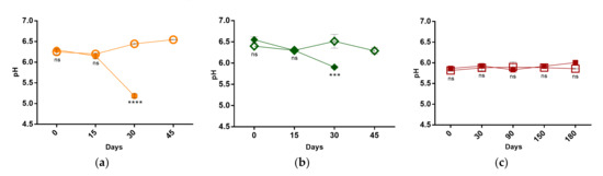 Evaluation of pH of (a) Macroalgae-fortified meat frankfurt sausage (pressurized—○ and non-pressurized—●), (b) Macroalgae-fortified vegetable frankfurt sausage (pressurized—◇ and non-pressurized—◆), (c) Macroalgae-fortified traditional Portuguese sausage (pressurized—□ and non-pressurized—■) during storage at 4 °C. ns indicate no significant differences, and ***, **** indicate significant differences between each pressurized and non-pressurized sample, p < 0.001 and 0.0001, respectively.