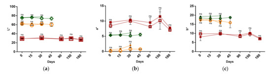 Color of fortified foods over time in different processing conditions (non-pressurized and pressurized). (a) L* (lightness) parameter, (b) a* (redness) parameter and (c) b* (yellowness) parameter of Macroalgae-fortified meat frankfurter sausage (pressurized—○ and non-pressurized—●), Macroalgae-fortified vegetable frankfurter sausage (pressurized—◇ and non-pressurized—◆), and Macroalgae-fortified traditional Portuguese sausage (pressurized—□ and non-pressurized—■) during storage at 4 °C. ns indicate no significant differences between each pressurized and non-pressurized sample.
