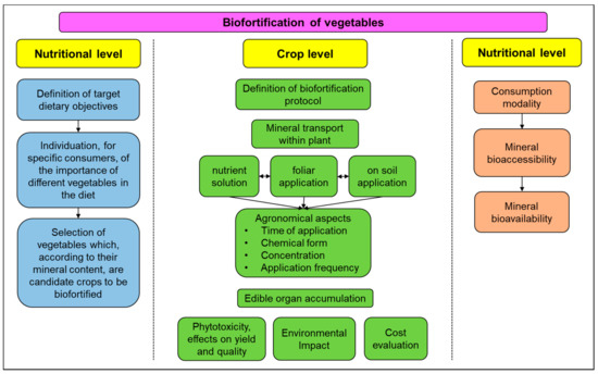 The papers discussed in this review report promising results for several minerals and pillar vegetables in the human diet; however, the results are not entirely consistent and coherent. The future activities, beyond their specific scientific relevance, should be planned in a broader context, adopting an approach involving also farmers, traders, nutritionists, and educators. Evidence from research shows that farmers are willing to cultivate and commercialize biofortified crops and the few and selected products available in the market demonstrates that consumers are favorably eating them. Furthermore, nutrition specialists together with health educators can also have an impact on the population’s eating habits and contribute to increase the consumption of the target vegetables. Such an approach, thanks also to the nutritional importance of vegetables, will certainly have a significant impact on improving human diet.