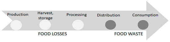 Food loss and waste according to their position in the supply chain. Source: based on Parfitt et al. [11]; Food and Agriculture Organization (FAO) [10], own editing.