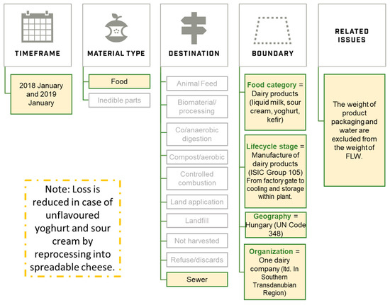 The methodology of the present study is based on the FLW standard (Figure 2), and accordingly, we determined the extent of milk loss at a company level, supplemented with loss values by each dairy product. Hereinafter, loss means the loss of raw milk or dairy products.