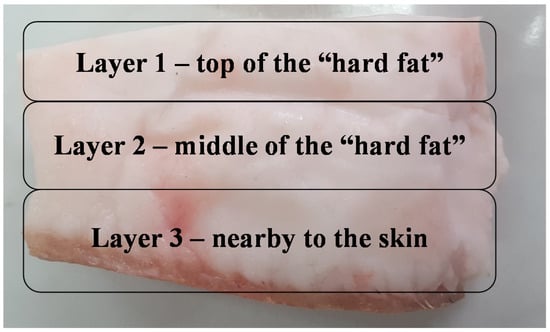 The fat samples were collected in the autumn of 2019 from mature Mangalitza pigs (Sus scrofa domesticus, “blonde” variety, age of 12 months, three male pigs, and weight of 70–80 kg) direct from the producer, which are growing the animals in a traditional and ecological system (Maramures county, Northern Romania, 47°37′5″ N and 23°28′44″ E, altitude ~164 m). In this study, the fatback part (hard fat) has been subjected to analysis, which is one of the most consumed pig fat, usually raw, cured, or fried. Samples have been maintained at 4 °C during the transportation and storage. Three hard fat fractions have been manually separated as following: (1) layer from the top of the hard fat, (2) layer from the middle of the hard fat, and (3) layer nearby to the skin (all of approximately one-third of the total thickness, Figure 1). On the other hand, lipid samples have been subjected or not to thermal processing as following: U-unprocessed (raw) lipid fractions (coded U1, U2, and U3 for all three layers), and P-thermally processed lipid fractions (coded P1, P2, and P3 for all three layers). Thermal processing was performed in a halogen-drying thermo-balance at 130 °C for 30 min, for approximately 5 g of lipid samples (Thermo-balance Partner WPS 210S, Radwag Intelligent Weighing Technology, Inc., capacity 210 g, division 0.001 g/0.01%, 2 halogen lamps/300 W, “strobe” interval 30 s). The European Union (EU) directives and regulations regarding the killing and manipulating of samples have been appropriately considered and respected by the producer, who provided the hard fat samples (Council Regulation (EC) No 1099/2009 on “The protection of animals at the time of killing,” Directive 2010/63/EU of the European Parliament and of the Council on “The protection of animals used for scientific purposes,” Regulation (EC) No 853/2004 and No 854/2004 of the European Parliament and of the Council on “Specific hygiene rules for on the hygiene of foodstuffs, and for the organization of official controls on products of animal origin intended for human consumption,” and Commission Regulation (EC) No 889/2008 on the “Implementation of Council Regulation (EC) No 834/2007 on organic production and labelling of organic products with regard to organic production, labelling, and control”). Sample preparation and analysis have been performed in duplicate.
