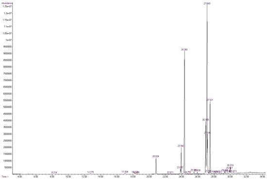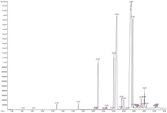 Gas chromatogram from the GC-MS analysis of the derivatized layer 1 of Mangalitza hard fat (thermally processed sample, code P1). All other GC chromatograms for the thermally processed samples are presented in the Supplementary material file (Figures S2, S5, S6, S9, and S10).