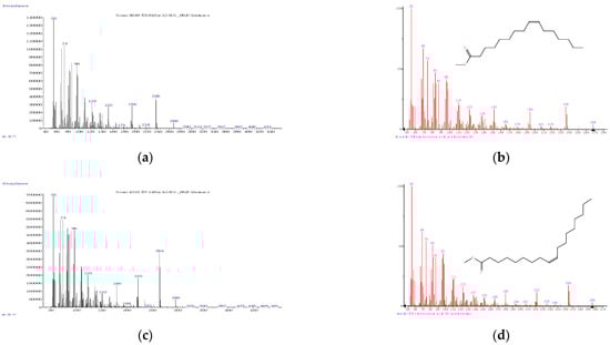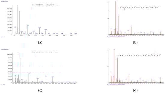 Experimental (left) and from the NIST 2011 database (right) mass spectra for the main fatty acids (as methyl esters) identified in the derivatized lipid fractions from Mangalitza hard fat—Saturated fatty acids (SFAs): palmitic acid (a,b) and stearic acid (c,d).