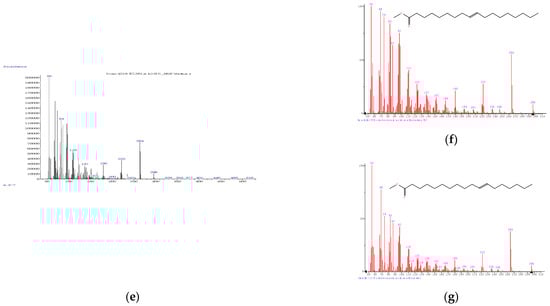 The main FAMEs have been identified with high probability by MS comparisons and their identities were confirmed by means of RIs. It is the case of palmitic acid, methyl ester (matching probability >81% for the first five hits in the NIST MS Search algorithm), stearic acid, methyl ester (matching probability >76% for the first four hits), and myristic acid, methyl ester (matching probability >82% for the first four hits) in the case of SFAs (Figure 5). In the case of MUFAs, the matching probability was lower, but the identities of compounds were confirmed by the second method based on RIs of the standard FAMEs. Thus, oleic acid methyl ester had the matching probability of only ~25%, but the identity was confirmed by the RI of ~2117 (Figure 6 and Table 1). Palmitoleic acid methyl ester had a matching probability >71% (for the first three hits) and RI of ~1917, while vaccenic and elaidic acids (as methyl esters, trans isomers) were not clearly separated by GC (they had matching probabilities lower than 14% and the RI of ~2120, Figure 6e–g and Table 1).