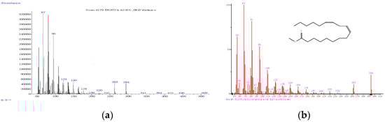 Experimental (left) and from the NIST 2011 database (right) mass spectra for the main fatty acids (as methyl esters) identified in the derivatized lipid fractions from Mangalitza hard fat—Polyunsaturated fatty acids (PUFAs): linoleic acid (a,b).