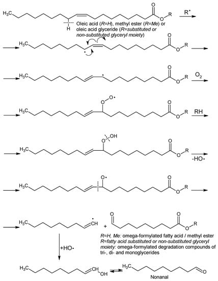 Proposed mechanism of thermal and oxidative degradation of a fatty acid glyceride or free fatty acid to the linear aldehydes and ω-formylated fatty acid derivatives (exemplification for oleic acid derivatives).