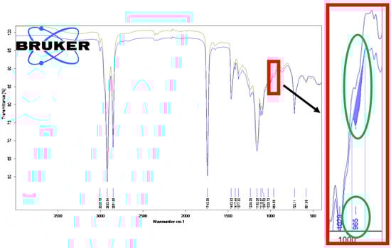 Fourier-transform infrared spectroscopy analysis (FTIR) was performed in order to identify the presence of the specific groups in degraded lipid fractions (e.g., trans fats). A Bruker Vertex 70 FTIR (Bruker Optik GmbH, Ettlingen, Germany), equipped with a single-reflection Platinum diamond attenuated the total reflectance sampling module (ATR) and a deuterated lanthanum α-alanine doped triglycine sulphate detector (DLaTGS) has been used for FTIR analysis of the raw and thermally processed Mangalitza lipid fractions. The FTIR analysis conditions were as follows: wavenumber range of 4000–400 cm−1, sensitivity >0.5%, resolution of 4 cm−1, 128 scans 128, phase resolution of 32, sample mass of ~10–20 mg. The ATR-FTIR (attenuated the total reflectance—Fourier-transform infrared spectroscopy) data—OPUS ver. 7.2 software (Bruker Optik GmbH 2012, Ettlingen, Germany) was used for acquisition and handling of the FTIR data. The background spectra was acquired in the air for every sample analysis and the ATR was well cleaned using isopropanol (FTIR grade, Sigma-Aldrich, St. Louis, MO, USA) until no residual bands were observed in the background spectra.