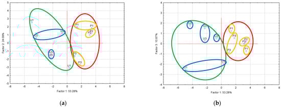 PCA is a valuable multivariate statistical analysis technique for evaluating the similarity-dissimilarity of samples (cases in PCA), i.e., raw Mangalitza lipid layers, as well as the corresponding thermally and oxidative degraded (processed) samples. It works with the raw data matrix (samples and variables) transformed by the translation and rotation in order to obtain a new coordinate named Principal Components (PCs) or Factors. First, this transformation is made in a way that provide maximum variance of the data for PC1. The second PC, PC2, is orthogonal on PC1, with the same observation related to the maximum variance (restricted by the orthogonality, and so on). Generally, only a few PCs are sufficient to explain the variance of the data (instead of the raw variables). On the other hand, the representation of translation coordinates gives the scores plot. Scores plot reveals the classification/grouping of cases (the similarity or dissimilarity of cases/samples). The representation of the cosines of the rotation angles gives the loadings plot. This reveals the influence of variables on the above-mentioned classification of the cases. Practically, PCA “transforms” variables into PCs (or Factors). Because it is difficult to compare all GC-MS data, taking into account the partial overlapping of information (e.g., the formation of aldehydes by oxidative degradation of unsaturated fatty acid glycerides generates an increase of the aldehyde content together with the decrease of the specific unsaturated fatty acid glycerides), the PCA technique helps the orthogonalization between variables. Sixteen variables (except those corresponding to C20:0, which was not identified in all samples, see Table 2, Table 3 and Table 4) representing the GC relative concentrations of all identified FAMEs in the raw and degraded Mangalitza lipid layers have been considered (variables —relative concentrations of the FAMEs—are coded in PCA as Cx:y, where x stands for carbon atoms and y for double bonds in cis configuration, except for t-trans configuration, cy-stands for fatty acids containing cyclopropane ring). Raw and processed lipid layers (samples/cases coded as U and P, respectively) were well discriminated by GC-MS-PCA analysis (Figure 10).