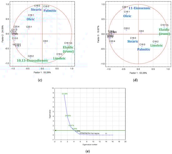 Principal Component Analysis (PCA) results for the gas chromatography-mass spectrometry (GC-MS) data of the derivatized lipid fractions from Mangalitza hard fat (relative concentrations data for specific fatty acid methyl esters, see Table 1 for codes. PC1–3 stand for Factors 1 to 3): (a) PC2 versus PC1 scores plot, (b) PC3 versus PC1 scores plot, (c) PC2 versus PC1 loadings plot, (d) PC3 versus PC1 loadings plot, (e) Eigenvalues of the correlation matrix (Principal Components, PCs, with significant influence to the explained variance are presented in green. Only a few PCs are sufficient to explain the variance of the data. In this case, the first four PCs explain 94.89% of the variance (instead of 16 raw variables). PCs with eigenvalues greater than 1 in the correlation matrix are considered to have a significant influence to the explained variance in the PCA technique). For other PCA results, see Supplementary material file (Tables S1–S6 and Figures S13–S16).