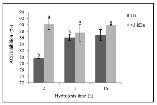 The hydrolysis time in general did not significantly influence the ACE inhibitory activity of ovalbumin hydrolysates (p > 0.05), although TH, OH4, and OH16 showed greater activity (86.07 ± 0.99% and 86.78 ± 1.75%, respectively) than OH2 (79.64 ± 0.06%) (p ≤ 0.05). In the molecular weight fractions < 3 kDa, there were no significant differences in the ACE inhibitory activity between the different hydrolysis times (p > 0.05).
