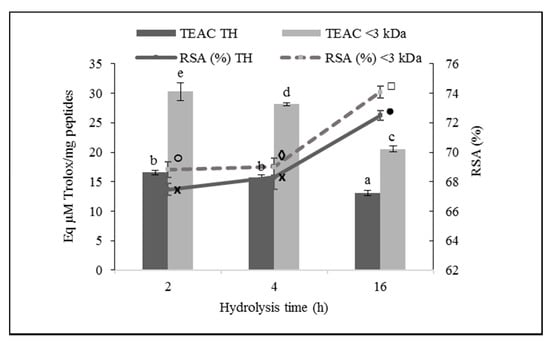 Figure 2. 2,2-Diphenyl-1-pycrylhydrazyl (DPPH) radical scavenging activity (RSA) of total ovalbumin hydrolysates (THs) and their low molecular weight fractions (<3 kDa). Bars show the Trolox equivalent antioxidant capacity (TEAC; µM of Trolox equivalents per mg of peptides), and lines represent the percentage of RSA. Values are means ± SEs (n = 3). Bars with distinct letters (a–e) and lines with distinct symbols (●, ×, □, ◊, ○) were significantly different (LSD test, p < 0.05).