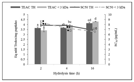 Figure 3. 2,2′-Azino-bis-(3-ethylbenzothiazoline-6-sulfonic acid) (ABTS) radical scavenging activity (RSA) of ovalbumin total hydrolysates (THs) and their low molecular weight fractions (<3 kDa). Bars show the Trolox equivalent antioxidant capacity (TEAC; mM of Trolox equivalents per mg of peptides), and lines represent the half-maximal scavenging concentration (SC50; µg/mL). Values are means ± SEs (n = 3). Bars with distinct letters (a–d) and lines with distinct symbols (●, ×, □, ◊) were significantly different (LSD test, p < 0.05).