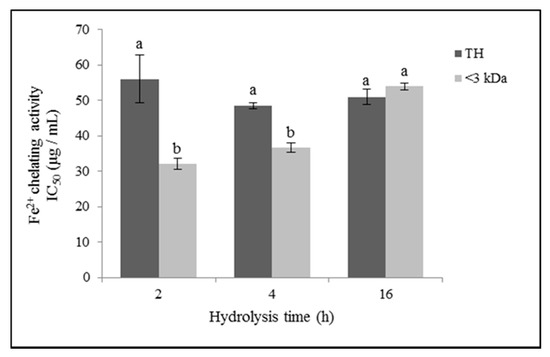 Figure 4. Iron (II) chelating activity (half-maximal inhibitory concentration (IC50); µg/mL)) of ovalbumin total hydrolysates (THs) and their low molecular weight fractions (<3 kDa). Values represent means ± SEs (n = 3). Bars with distinct letters (a–b) were significantly different (LDS test, p < 0.05).
