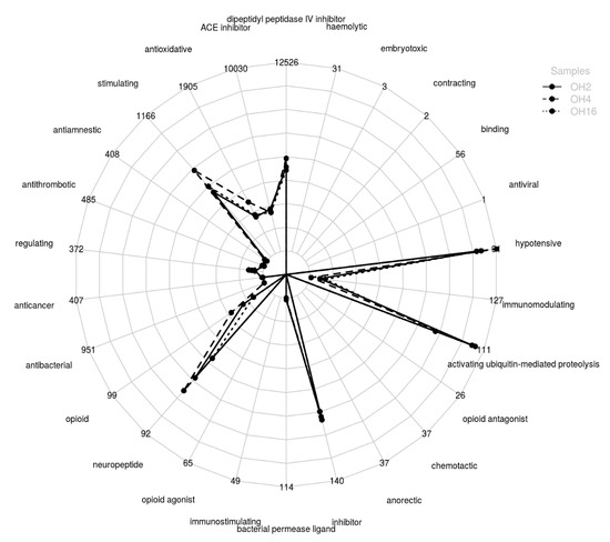 On the other hand, in the ovalbumin hydrolysates with C. scolymus L. flower extract, peptides with possible potential biological activity have been identified, since encrypted sequences that have demonstrated bioactivity have been found within their primary structure. Figure 5 shows the distribution of the peptides with putative activity present in the ovalbumin hydrolysates at the three hydrolysis times. At all hydrolysis times, peptides containing sequences with bioactivity were obtained. OH4 yielded the highest amount of peptides with fragments with bioactivity, highlighting antioxidant activity, hypotensive activity, inhibition of dipeptidyl peptidase IV activity, activation of proteolysis mediated by ubiquitin activity, stimulant activity, opioid activity, and peptides with sequences that work as neuropeptides.
