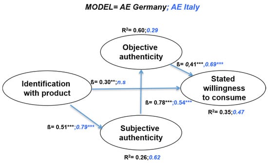 Both German and Italian models comprised one exogenous latent variable (identification with the product) and three endogenous latent variables (subjective and objective authenticity, as well as stated willingness to consume).
