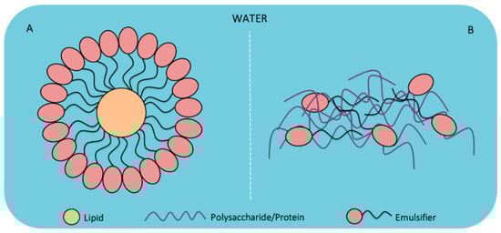 Emulsions are systems composed of liquid or semi-liquid substances that are immiscible to each other, e.g., an oil and aqueous phase that can be merged by means of an emulsifying agent. The emulsifying agent generally possesses a hydrophilic and a hydrophobic zone, displaying an affinity to polar and non-polar sites [,]. Thus, emulsions can be classified in two types depending on the proportions of their phases, e.g., oil/water (o/w) or water/oil (w/o) because the dispersed phase corresponds to the second component, being in lower concentration in the emulsion [,]. In the formulation of edible films and coatings, the o/w systems are preferred (Figure 3A) since they are thermodynamically more stable and they can dissolve lipophilic antimicrobial components (e.g., plant essential oils) and bioactive components (e.g., fatty acids, carotenoids, antioxidants, phytosterols, or quinones) [].