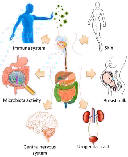 Probiotics are a type of bioactive compounds with specific health benefits []. According to the definition in 2002 given by the Food and Agriculture Organization of the United Nations/World Health Organization (FAO/WHO), probiotics are “live microorganisms which, when administered in adequate amounts, confer a health benefit on the host” []. LAB of the genus Lactobacillus have been widely studied for their probiotic properties since they play an important role in preventing the deterioration of the microbiota and in the inhibition of pathogenic microorganisms (Table 4) at the oral cavity and colon []. In addition, there is evidence that relates the metabolic activity of LABs with the control of bacterial pathogens and fungal agents []; specifically, the authors associate the inactivation of pathogens by the effect of organic acids (e.g., lactic and acetic acids), carbon dioxide, ethanol, peptide compounds, and enzymes, that are produced within LABs metabolism []. Other authors relate the decrease in pH with the inhibitory effect because it generates an environment competition between the substrates of LABs and pathogenic microorganisms [,]. For this reason, the most exhaustive studies in probiotic evaluation have been carried out in the incorporation of microorganisms in edible films and coatings, rather than on their inhibitory efficacy against external pathogens (due to contamination of the environment). Figure 5 presents an overview of the main systems and organs benefited by the consumption of probiotic microorganisms, highlighting (i) the immune system: inflammatory control is maintained; (ii) the microbiota: the proliferation of pathogenic microorganisms, such as Clostridium difficile and Helicobacter pylori, is regulated; (iii) the nervous system: brain functions are modulated; (iv) the urogenital tract: urogenital infections are fought; (v) the placenta: probiotic microorganisms are transmitted to the fetus; and (vi) the skin: allergies and atopic dermatitis is helped [].