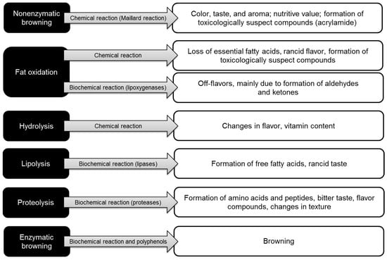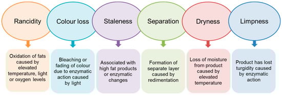 Currently, the food industries have a duty to offer to the consumers fresh, pleasant, good quality food with beneficial properties for health []. However, the challenge of meeting consumer demands is very demand since there is no food that can remain in optimal conditions and maintain its properties permanently due to the natural deterioration generated by chemical, and biochemical reactions and physical changes []. Figure 6 and Figure 7 illustrate the different biochemical and physical defects developed in foods, respectively. Commonly, observed spoilage changes include unpleasant odors, rancidity, darkening, softening of the texture, and loss of nutrients and vitamins.