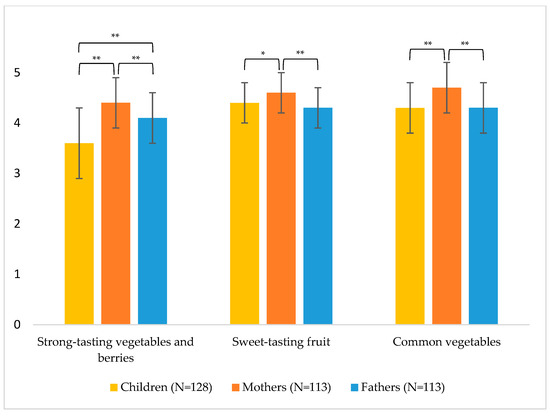 Children’s mean preference for strong-tasting vegetables and berries was significantly lower than that of mothers and fathers (Z = −8.88, p < 0.001 between children and mothers, Z = −6.41, p < 0.001 between children and fathers) (Figure 1.). Also, the preference for strong-tasting vegetables varied between mothers and fathers (Z = −4.86, p < 0.001). For sweet-tasting fruit and common vegetables, no significant differences were found between children and fathers, but mothers’ scores were significantly higher than those of children (Z = −2.86, p < 0.004 for sweet-tasting fruit and Z = −6.28, p < 0.001 for common vegetables) and fathers (Z = −4.10, p < 0.001 for sweet-tasting fruit and Z = −5.46, p < 0.001 for common vegetables).