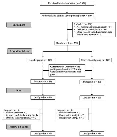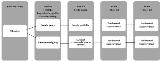 Participants in the present study constitute a sub-group of the 250 four to six-month-old infants recruited to the “Optimized complementary feeding study” (OTIS; ClinicalTrials.gov registration number NCT02634749) from April 2015 and January 2018, in Umeå, Sweden. A detailed description of the study protocol has been published elsewhere [50]. In the current study, one-third of the participants in the OTIS study were randomly allocated after study start (Figure 1) to evaluate eating behaviors and food acceptance at 12 and 18 mo of age from both the Nordic group (NG) and Conventional group (CG). A subsample was used due to the extra effort for the families to participate in the home exposure meals and to be cost-efficient. Inclusion and exclusion criteria for this effort were the same as for the OTIS study, i.e., healthy singleton infants, 4–6 mo of age at inclusion, born after >37 weeks of gestation with birth weight >2500 g, and living in and intending to remain in Umeå during the 12 mo duration of the study, and with no chronic illnesses that would affect nutrient intake or the outcomes of the study. Other exclusion criteria were iron deficiency, any other biochemical abnormality or having started CF at the time of recruitment. Infants were exclusively breast-fed and/or formula-fed at the study start. Parents, research nurses and dieticians who calculated the dietary intake from the FR could not be completely blinded to the group allocation since the food items given to the infants could not be blocked entirely. However, the parents were blinded to the hypotheses of the study. The pediatric dietician, who videotaped the exposure meal in the family’s home, and the psychologist and masters students in psychology who coded and analyzed the videotaped exposure meals were blinded for the infant’s group allocation as were the laboratory team and researchers responsible for the laboratory analyses.