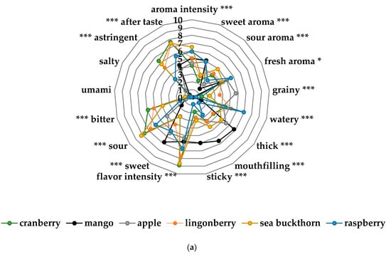 The sensory profiling showed differences across the sensory attributes from the taste portion schedule in bitter taste, sour taste, flavor intensity and astringent flavor (Figure 4a,b). Nordic berries and root vegetables were significantly different to the two commercial baby food products (mango, corn-potato). As demonstrated in Figure 4c–e there was significant changes across the attributes in the sensory profile from the home exposure meals when cow’s milk and yogurt was added to the lingonberry and cranberry purées. Particularly, the lingonberry milk and the cranberry yogurt had significantly less bitter taste (p < 0.001), flavor intensity (p < 0.001), astringent flavor (p < 0.001) and sour taste (p < 0.05).