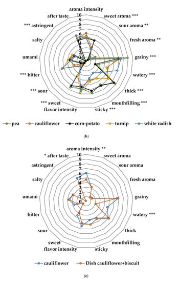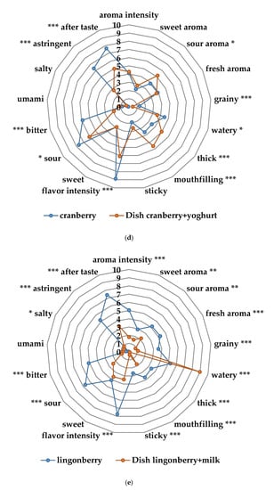 (a) Sensory profiles of the different fruit and berry purées in the taste portion schedule together with mango purée, a commercial product from Semper AB; (b) sensory profiles of the different vegetable purées in the taste portion schedule together with corn-potato purée, a commercial product from Semper AB; (c) sensory profile of the cauliflower spread of the exposure meal compared to the cauliflower purée in the taste portion schedule; (d) sensory profile of the cranberry yogurt in the exposure meal compared to the cranberry purée in the taste portion schedule; (e) sensory profile of the lingonberry milk of the exposure meal compared to the lingonberry purée in the taste portion schedule. Significant differences across the sensory attributes * p < 0.05, ** 0.01< p < 0.05, *** p < 0.001.