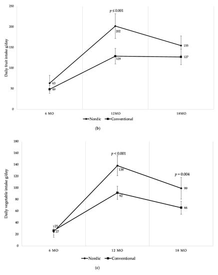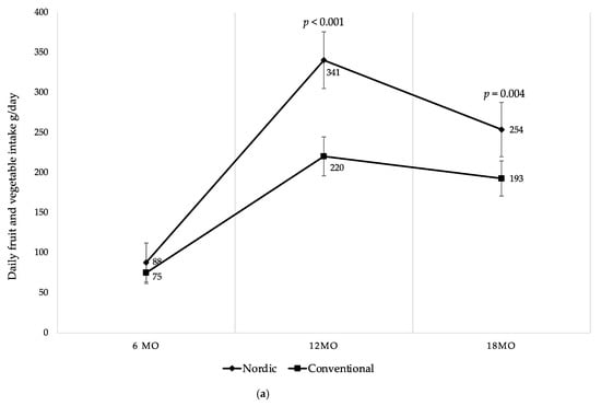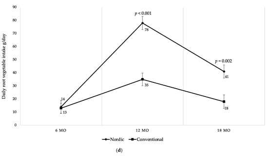 (a) Mean daily fruit and vegetable intake (g/day) at 6, 12 and 18 mo of age; (b) mean daily fruit intake (g/day) at 6, 12 and 18 mo of age; (c) mean daily vegetable intake (g/day) at 6, 12 and 18 mo of age; (d) mean daily root vegetable intake (g/day) at 6, 12 and 18 mo of age. Fruit juices, vegetable juices, potatoes, chili, garlic, ginger and herbs are not included in the calculations. Whiskers indicate 95% confidence intervals. p-values indicate between group differences.