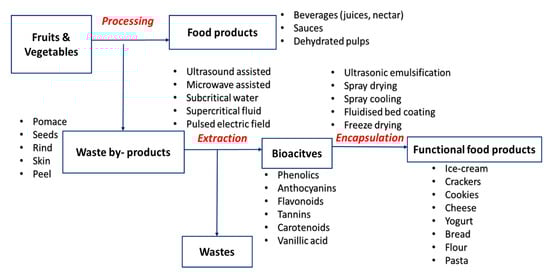 Numerous efforts have been made to utilize bioactive compounds embedded in F&V wastes [6,7]. The bioactive compounds are extracted from the wastes through different extraction techniques [8,9,10,11]. Depending upon the nature of the raw material and the type of bioactive to be extracted, different extraction methods are selected [12]. The recovered bioactive compounds can be used as ingredients to fortify food products, in the pharmaceutical or cosmetics industries [13]. However, there is a high risk of degradation during functional food development. To protect extracted bioactive compounds from severe processing conditions and environmental factors, they can be encapsulated within a coating material [14,15,16,17]. The selection of coating material is dependent on the ratio of the enclosed material (core), which plays a major role in producing uniform spherical microcapsules with high encapsulation efficiency. Contrarily, there are minimal studies that encompass all the fundamental aspects of waste valorization beginning from extraction to functional products via encapsulation. The encapsulated bioactive compounds can be utilized for the development of functional food products that may have many health benefits [18]. These by-products in some forms are added to various food products like meat, sausages, cheese, yogurt, curd, butter, ice-cream, juices, fruit purees, bakery products, and candies [19,20,21].