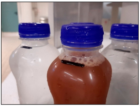 A GC 320 gas chromatograph (GL Sciences, Tokyo, Japan) equipped with a thermal conductivity detector and equipped with a CTR column (Alltech® IC, Sedriano, Milan, Italy) for the separation of O2, N2, CH4, CO, CO2 was used for detection. A total of 50 μL gas was withdrawn from the bottle headspace with a 100 μL gas-tight syringe (Hamilton, CA, USA) and injected into the column at 55 °C. The carrier gas was helium with a flow rate of 1 mL/min. The identification of the chromatographic peaks was performed by comparison with the retention times of the peaks related to known standards. The quantitative determinations of the gases were based on the comparison between the areas of the peaks obtained and those of the peaks produced by known volumes of pure gas. The analysis of the gas composition was carried out at regular intervals up to 28 days (0, 7, 14, 21, and 28 days) in duplicate on PET and PLA bottles before opening for further analysis. The results were reported as O2% and CO2%.