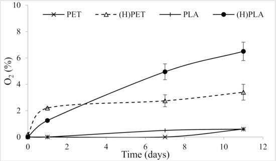 The test carried out on bottles by the non-destructive laser spectroscopy-based method allowed to monitor the same sample bottles with no interference by possible air leakage during sampling. Our results showed that the liquid content of the bottle contributed to increasing the O2 headspace concentration, even if the initial gas level was set to zero. The data in Figure 2 showed that PLA and PET bottles filled with water had the highest O2 levels, while the empty bottles filled with N2 maintained very low O2 levels (<0.2%), irrespective of the polymer nature.