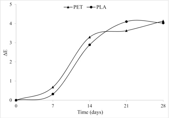 Besides, ΔE was calculated for each packaging option (Figure 3). This parameter converts the color coordinates into an indicator that can be related to human perception. ΔE showed an exponential trend in the first 14 days, followed by a steady state until the end of observations, irrespective of the packaging type. Total color variation was very small up to seven days of refrigerated storage for both PET and PLA bottles ranging from 0.2–0.5, respectively. At the end of 28 days of storage, the total color difference for both PET and PLA bottles was similar and showed very distinct variations corresponding to 3.90.