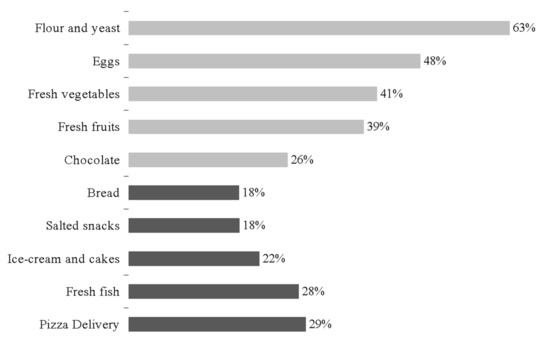 Regarding food purchase trends, a selection of the most increased and decreased foods is shown in Figure 1. Baking products and fresh healthy food had the largest sales increase by individuals (flour and yeast +63.2%, eggs +48.4% fresh vegetables +41.2%, fresh fruits +39.0%) as well as chocolate (+26.4%) as indulgence food. Large increases affected pasta and UHT milk, too. The largest individual purchase decreases affected bakery products (pizza delivery −29.4%, ice-cream and cakes −21.7%, bread −18.3%), highly perishable foods (fresh fish −28.2%) and salted snacks (−18.4%). The complete list of purchases is available as a Supplementary Materials.