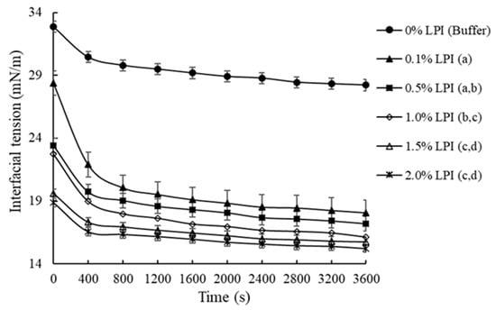 Figure 1 illustrates that the IT started to decrease after a few seconds once the analysis began, thus initiating the process of LPI adsorption at the oil-water interface. The IT of all samples containing LPI at different concentrations decreased considerably (p < 0.05) when the time of protein adsorption at the oil-water interface increased from 0 to 800 s. The function of an emulsifier like proteins is to lower the interfacial tension covering the surface of the new-formed oil droplets with a protective layer and to stabilize the droplets in the continuous aqueous phase [26]. According to Miller [27], the IT begins to decrease sharply once a particular interfacial coating of the protein at the oil-water interface is reached, a stage known as the penetration period, completely saturating the oil droplet in the emulsion. However, the results suggested that IT was not altered notably (p > 0.05) when time increased from 800 to 3600 s. These results showed that the period of LPI saturation at the oil-water interface is from 800 s onwards, given that relatively constant interfacial tension values were achieved. During this phase, the protein was located at the oil-water interface, where it could adopt a new structural configuration in which polar groups interact with water, and non-polar groups interact with oil, a process known as interfacial denaturation [27].